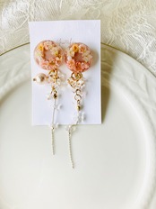 お花のカボションにチェーン×ビーズのロングパーツのついたイヤリングです。