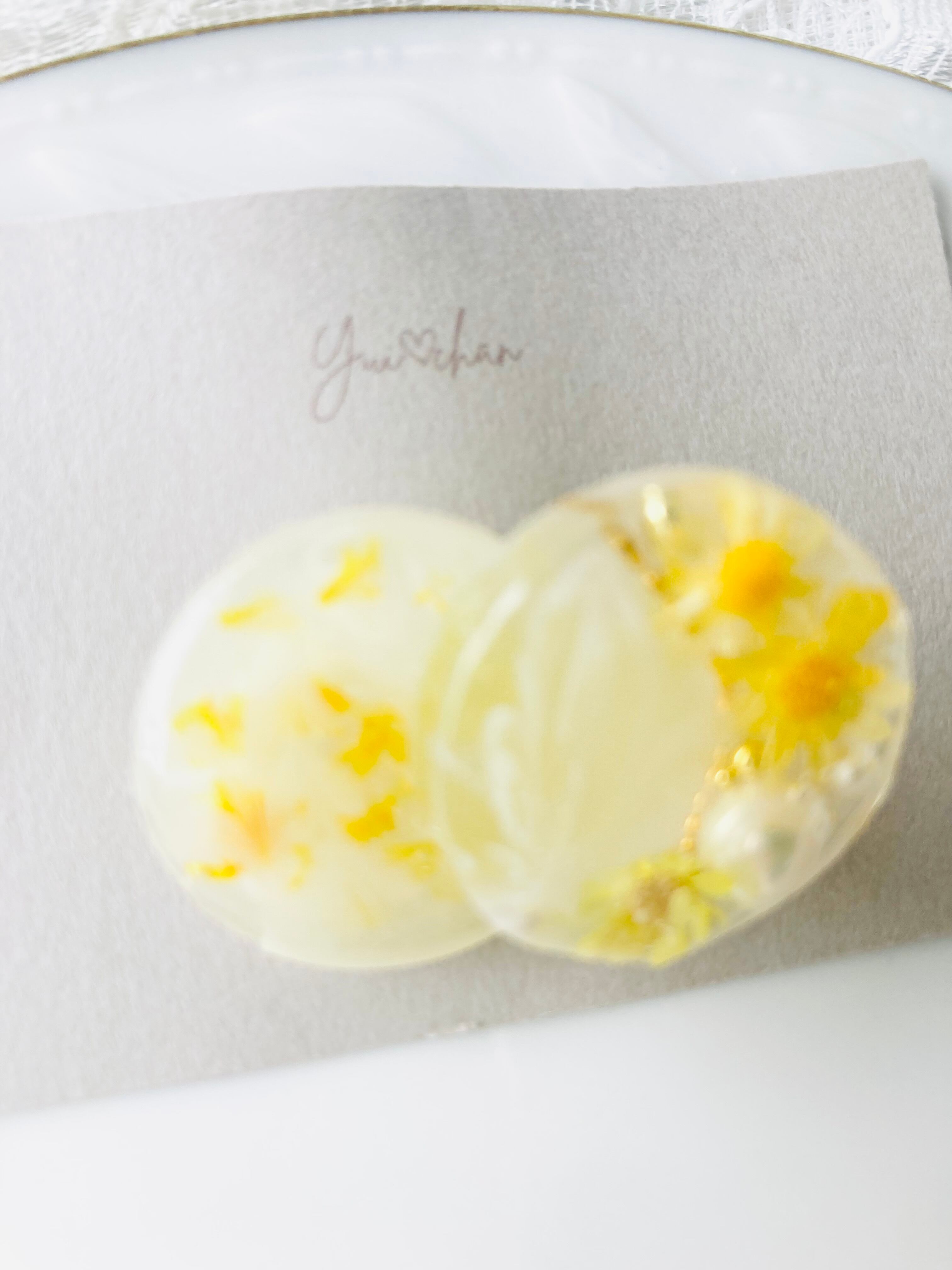 イエローのお花を集めてブローチに仕立てたら、レモンキャンディのような可愛らしい作品になりました。