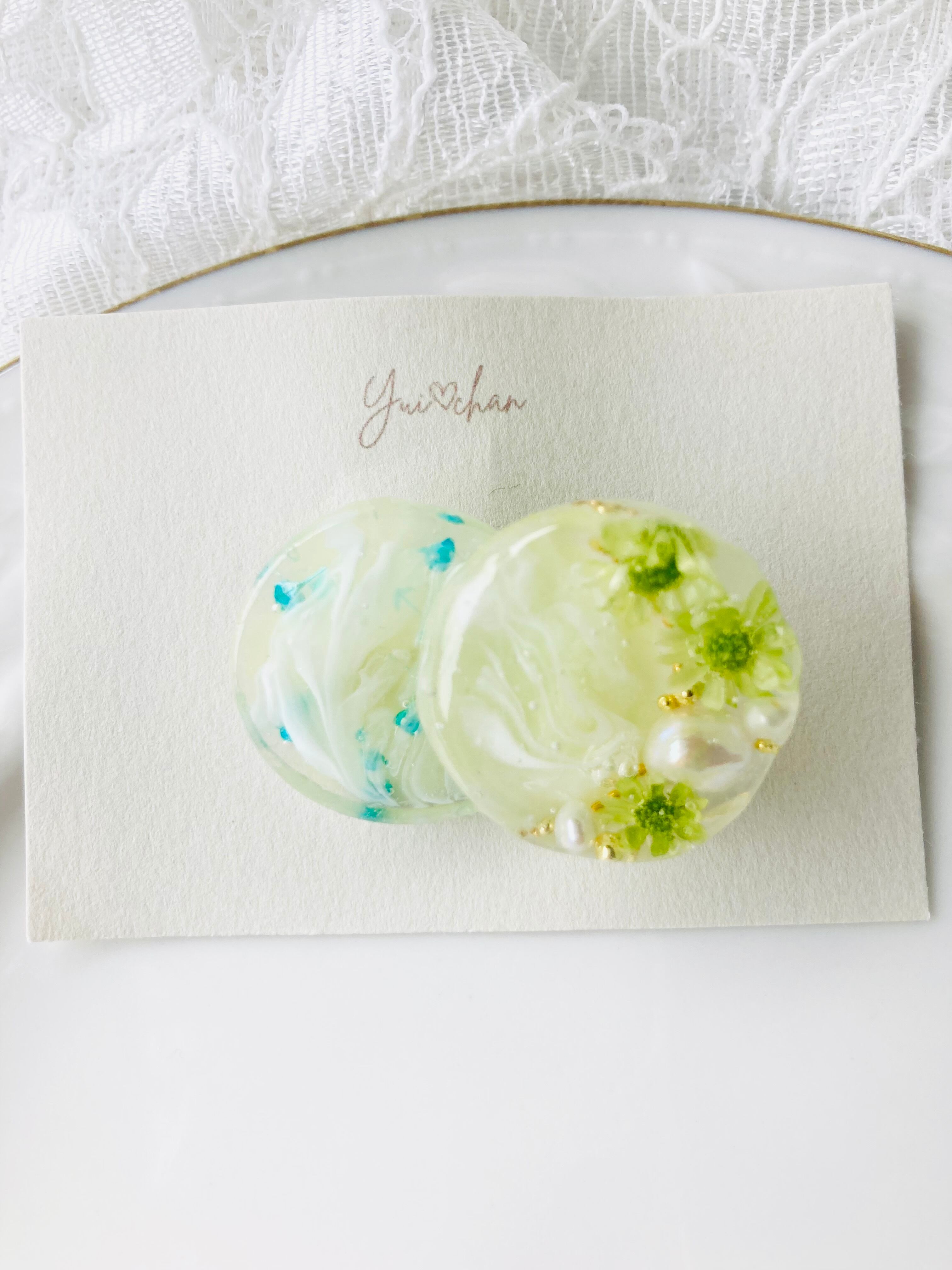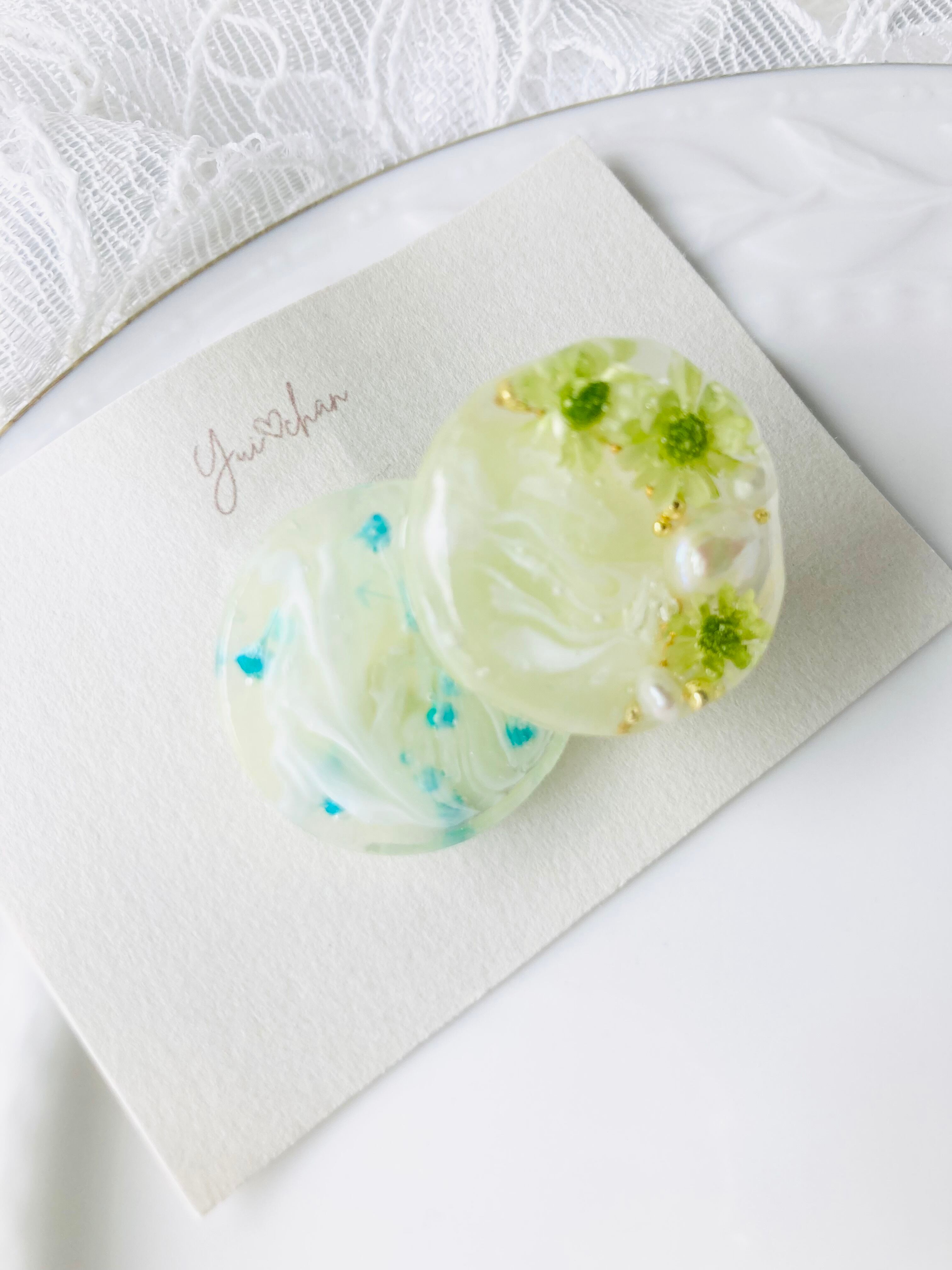 グリーンカラーのお花を集めてブローチに仕立てたら、キャンディのような可愛らしい作品になりました。