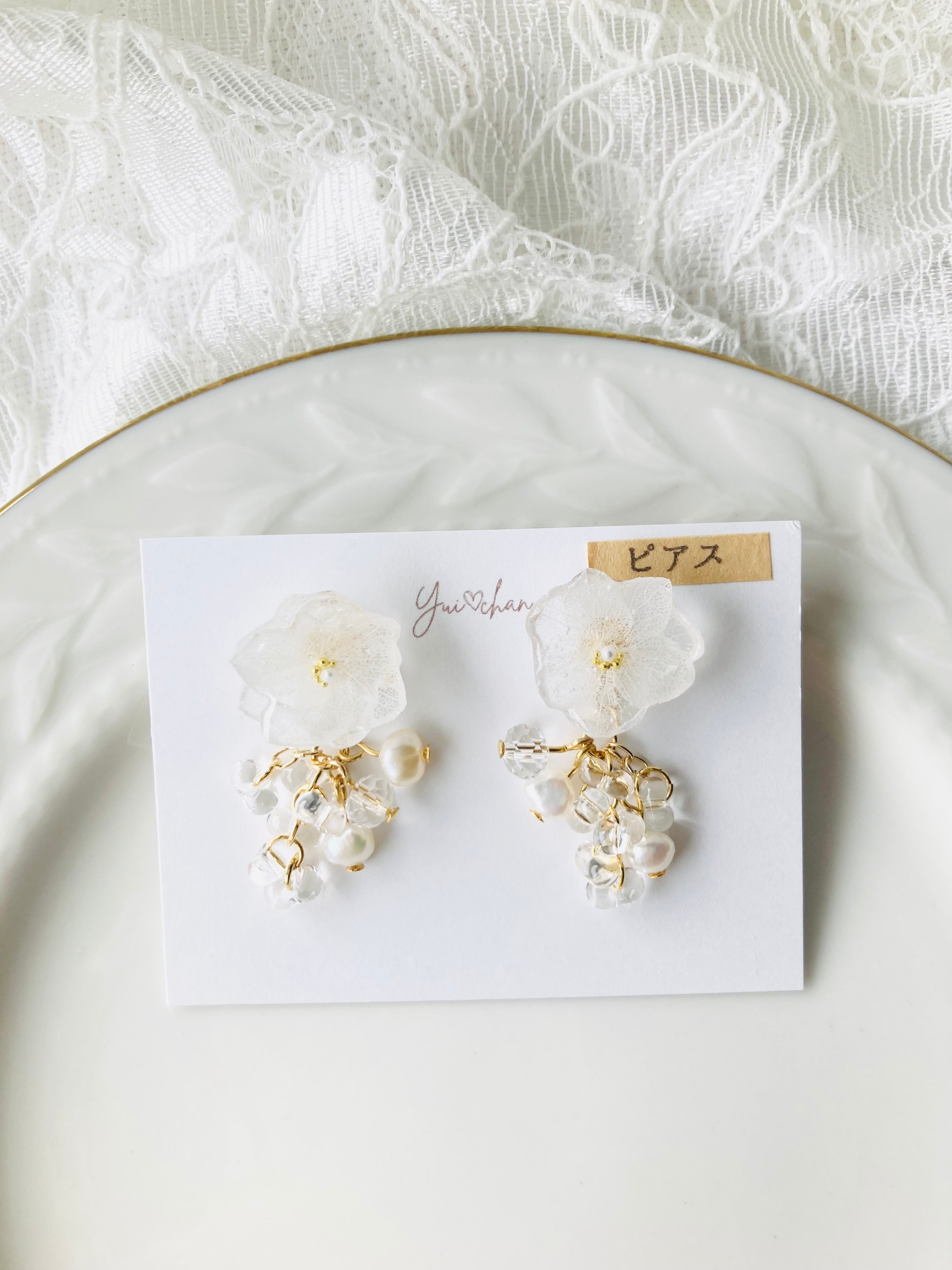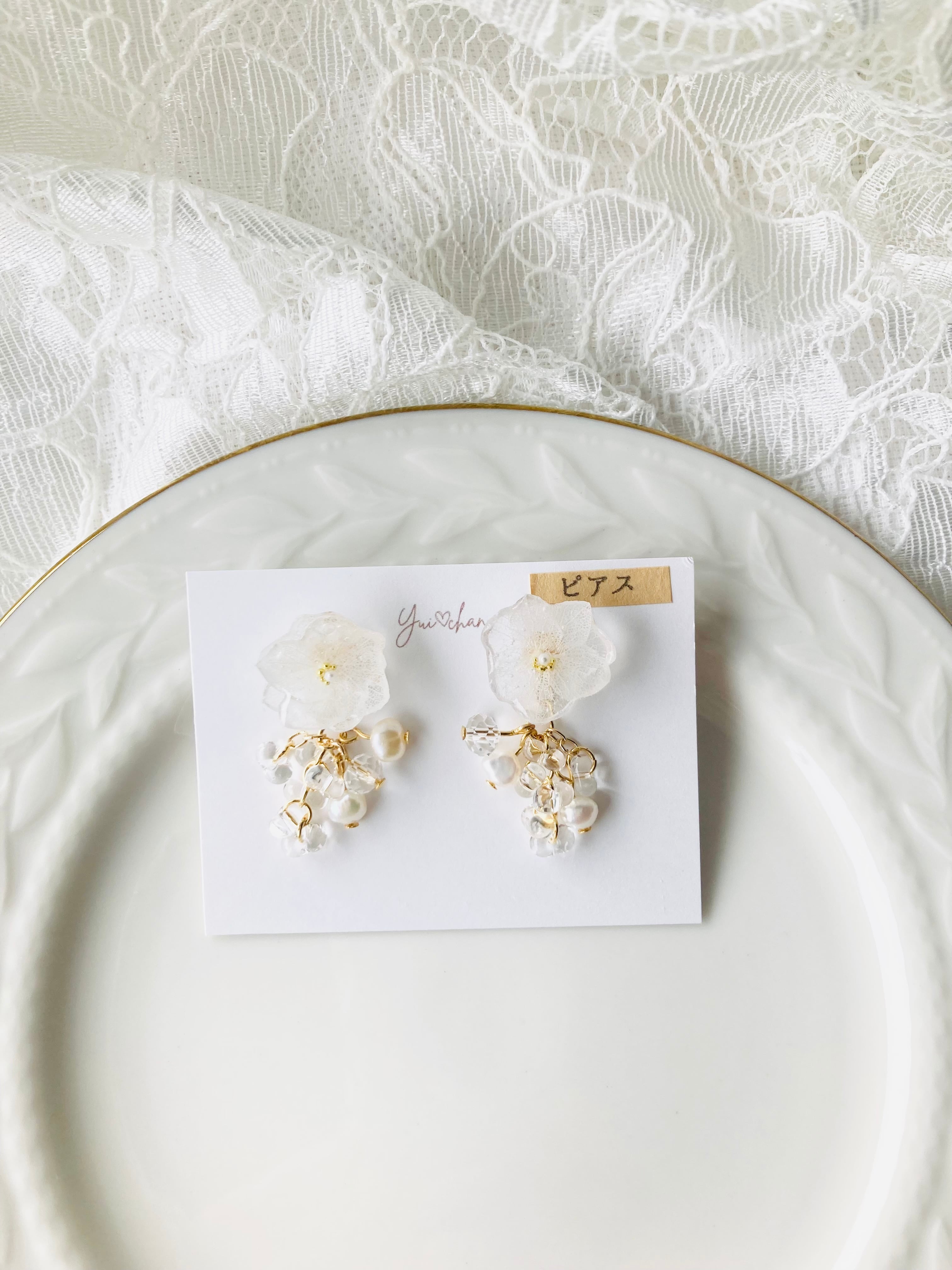 ホワイトの紫陽花の花びらを使って八重咲のお花を創作した作品です。