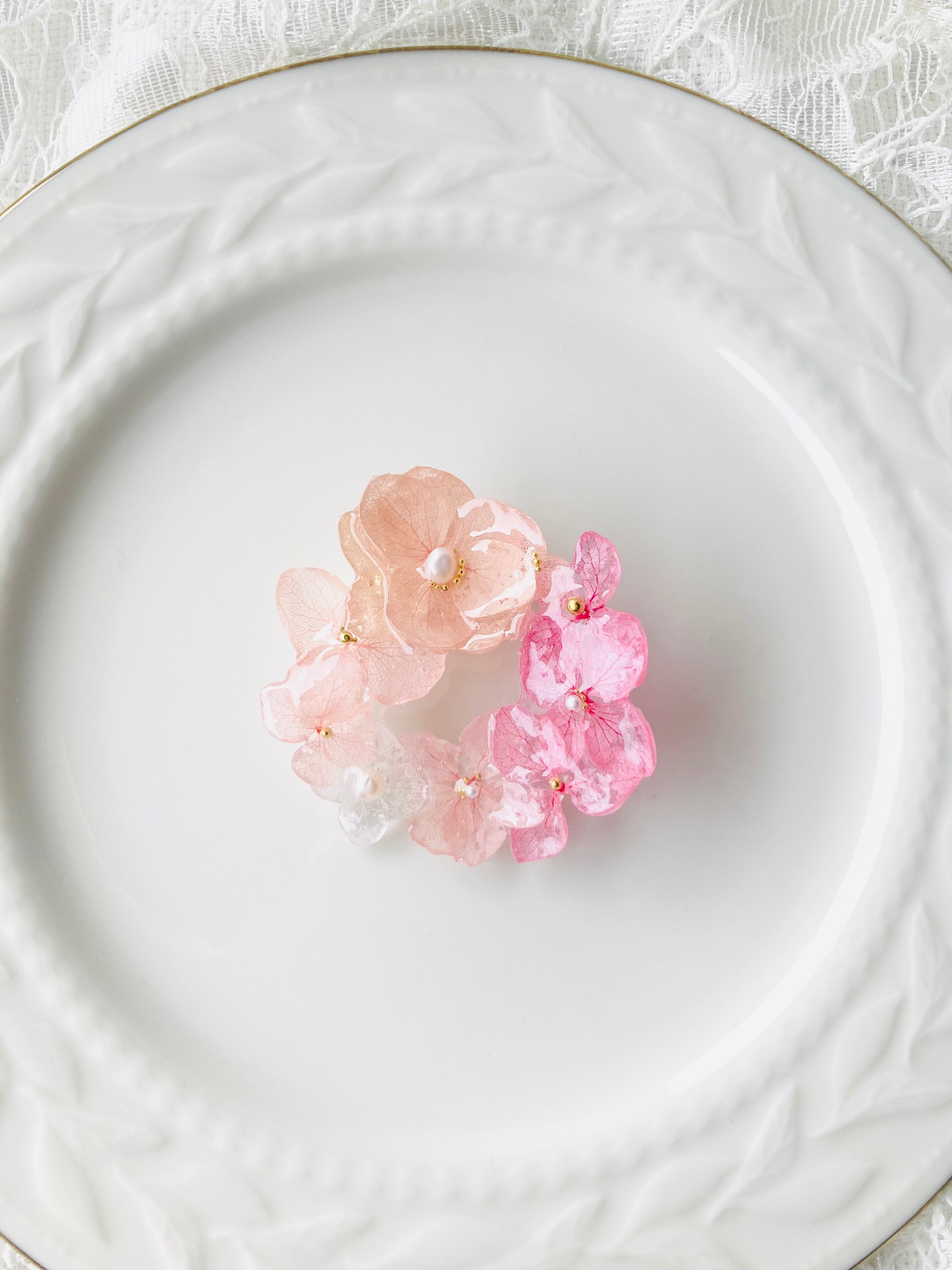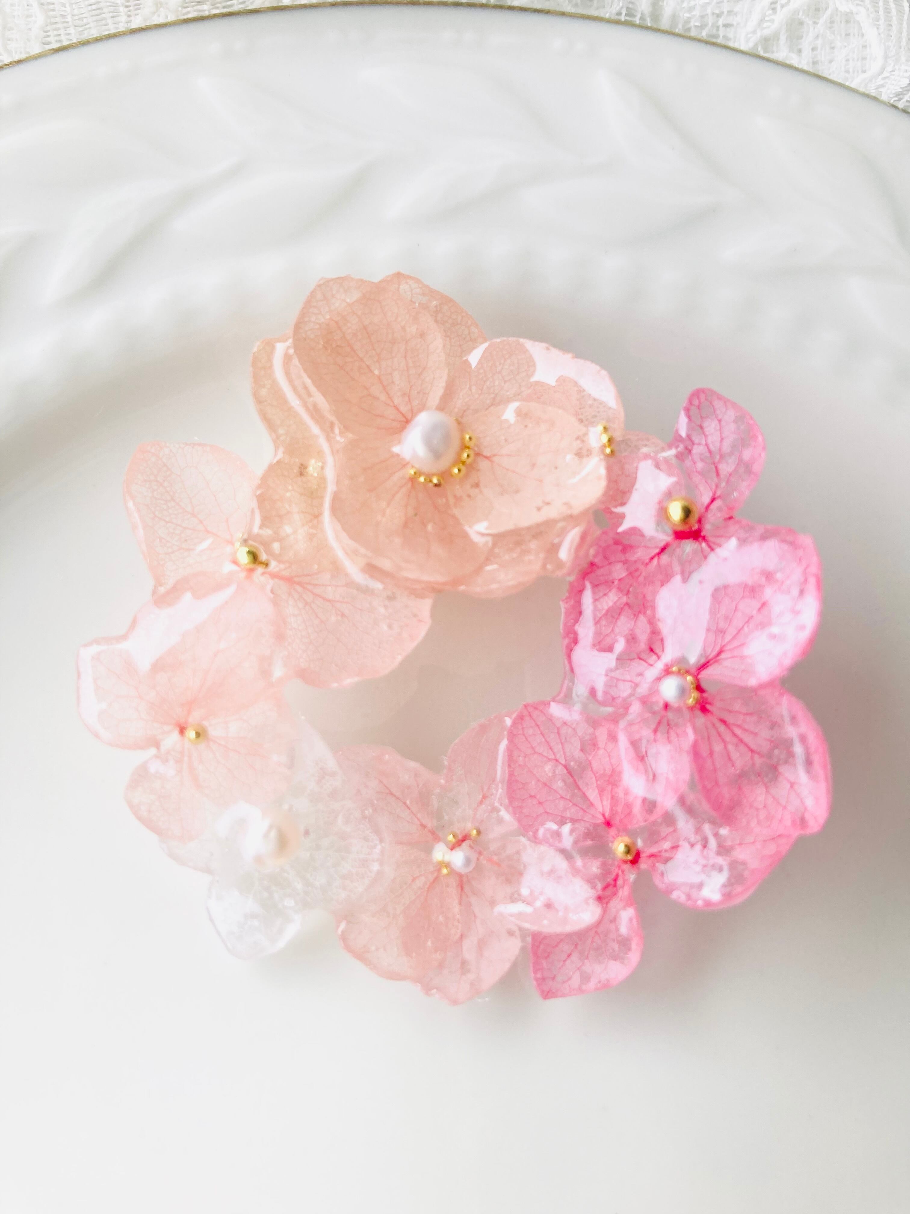 紫陽花のお花をリースのように丸い輪にしてレジンコーティングした作品です。