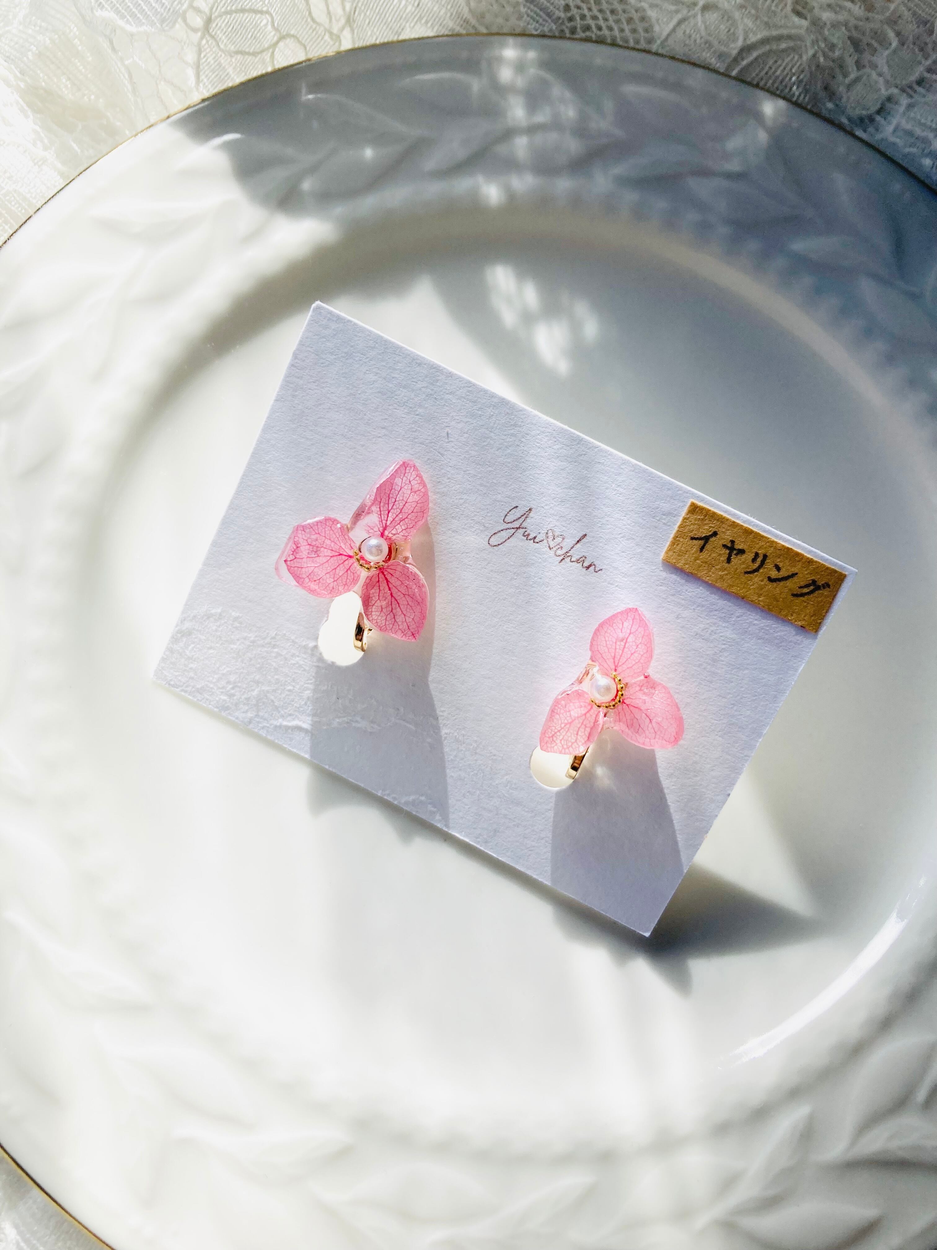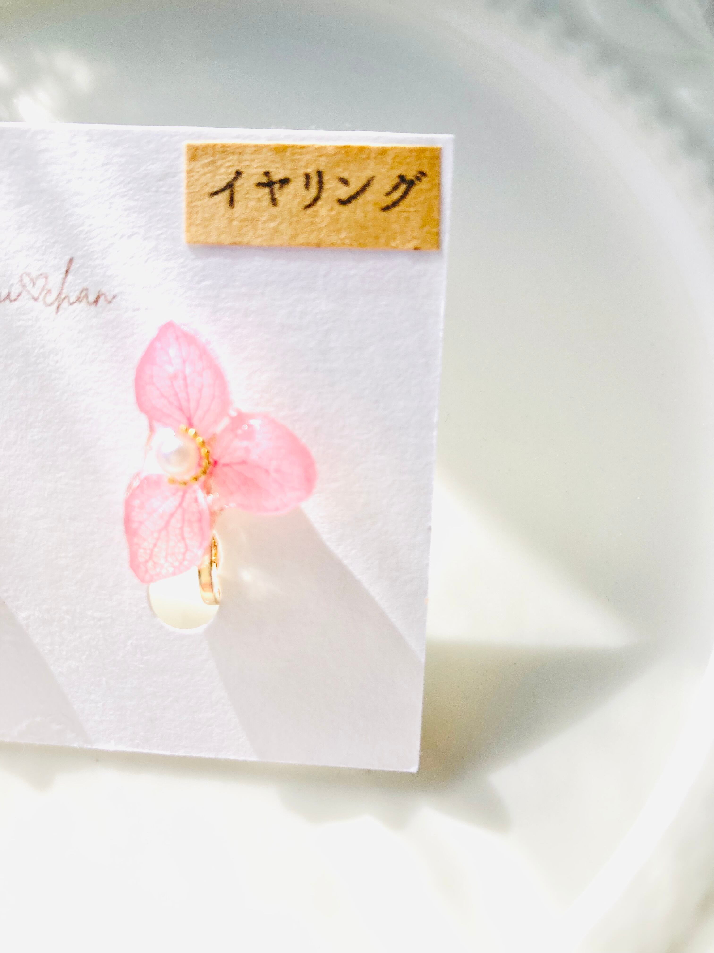 小さなあじさいをレジンコーティングでイヤリングに仕立てました。